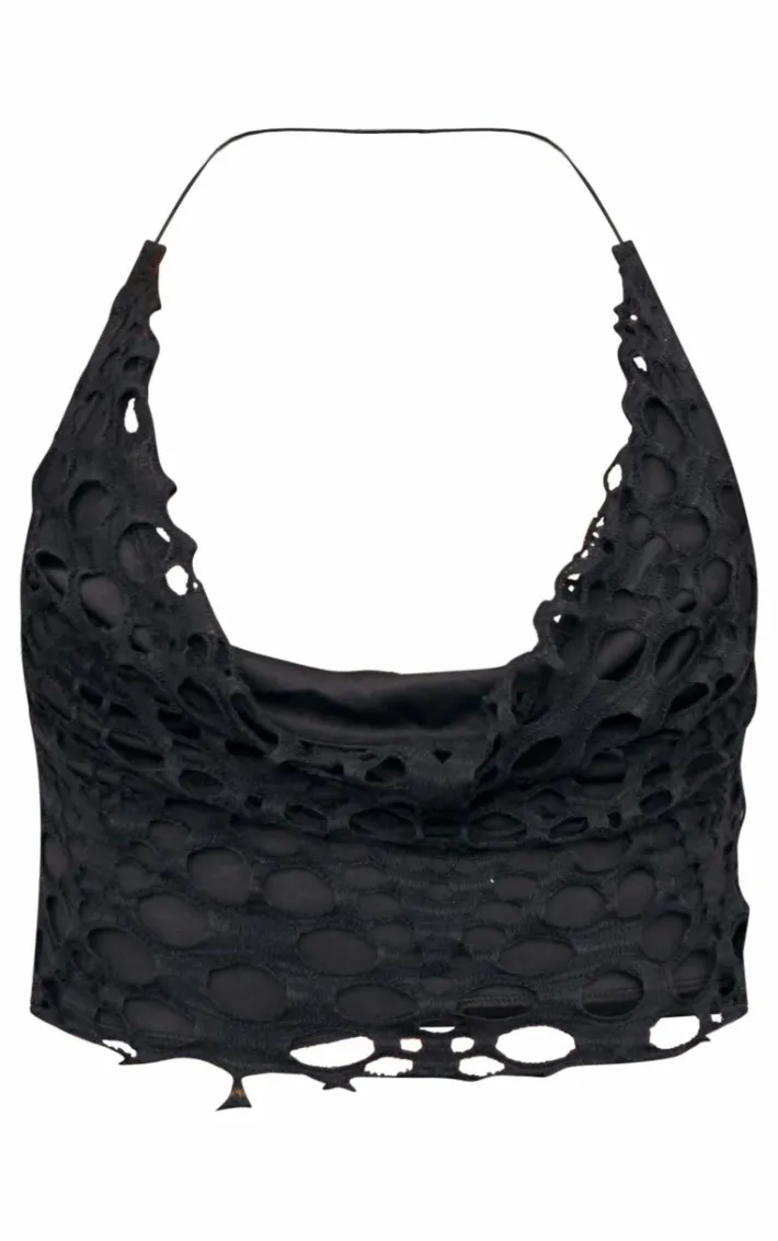Keep your outfit effortlessly chic with this black distressed overlay cowl neck top. Brought to you in a black material with a distressed design and an overlay detailing, all eyes are sure to be on you. This cowl neck top is sure to solve all of those what to wear dilemmas and beyond. Team with your fave accessories, a mini skirt and your fave knee high boots for a fool proof finish.