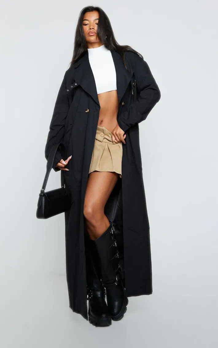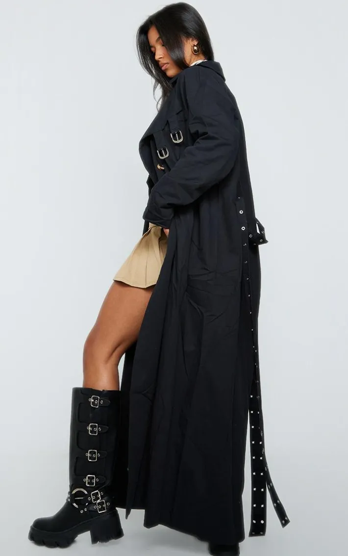 Take your outfit of the day that extra mile with this black eyelet detail belted maxi trench coat, you’re sure to be setting trends wherever you set foot. This trench coat features a black material with eyelet detailing and a maxi length, what more could you want? Team this trench coat with a basic top, a mini skirt and chunky boots for a combo we’re crushing on.