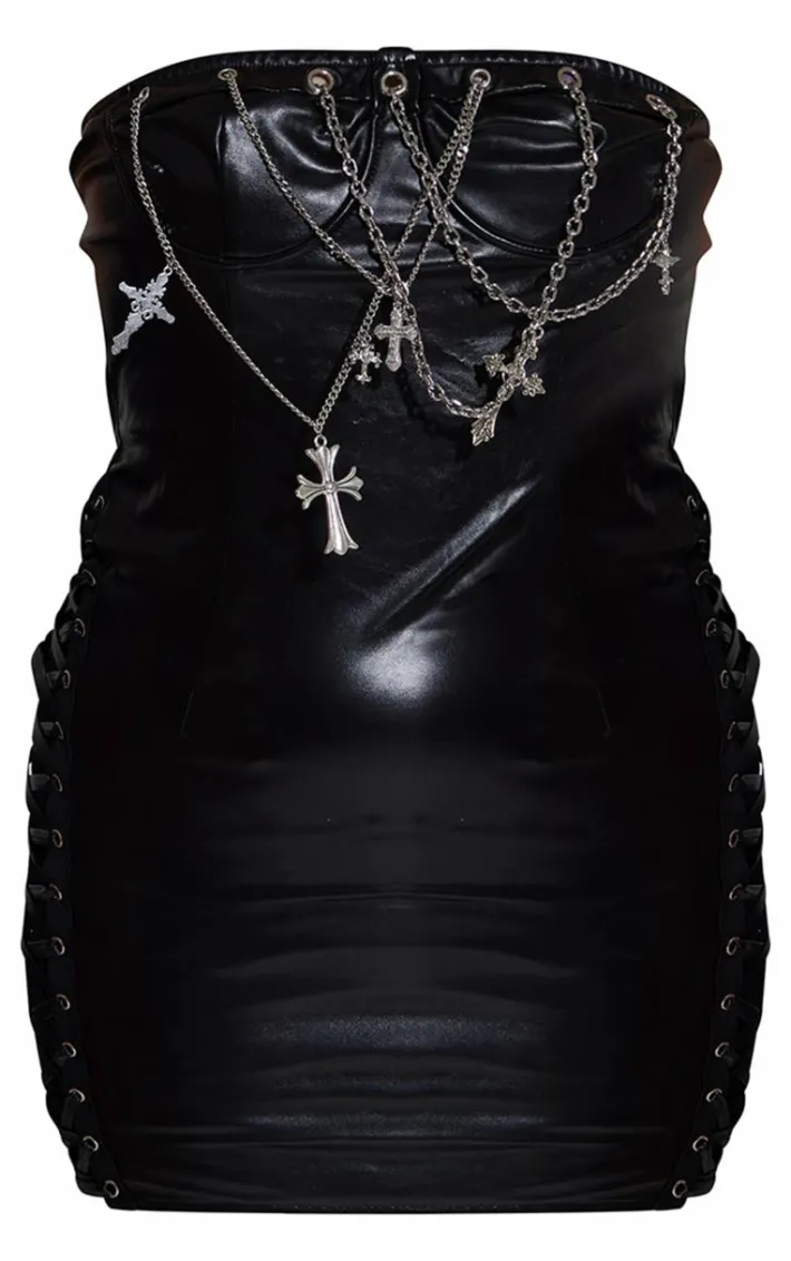 Make hearts race with this black faux leather bandeau cross chain detail bodycon dress. This dress is brought to you in a black faux leather material with a bandeau style and a cross chain detail, what’s not to love about this? To complete the look style with high heels and accessories to finish off the look.