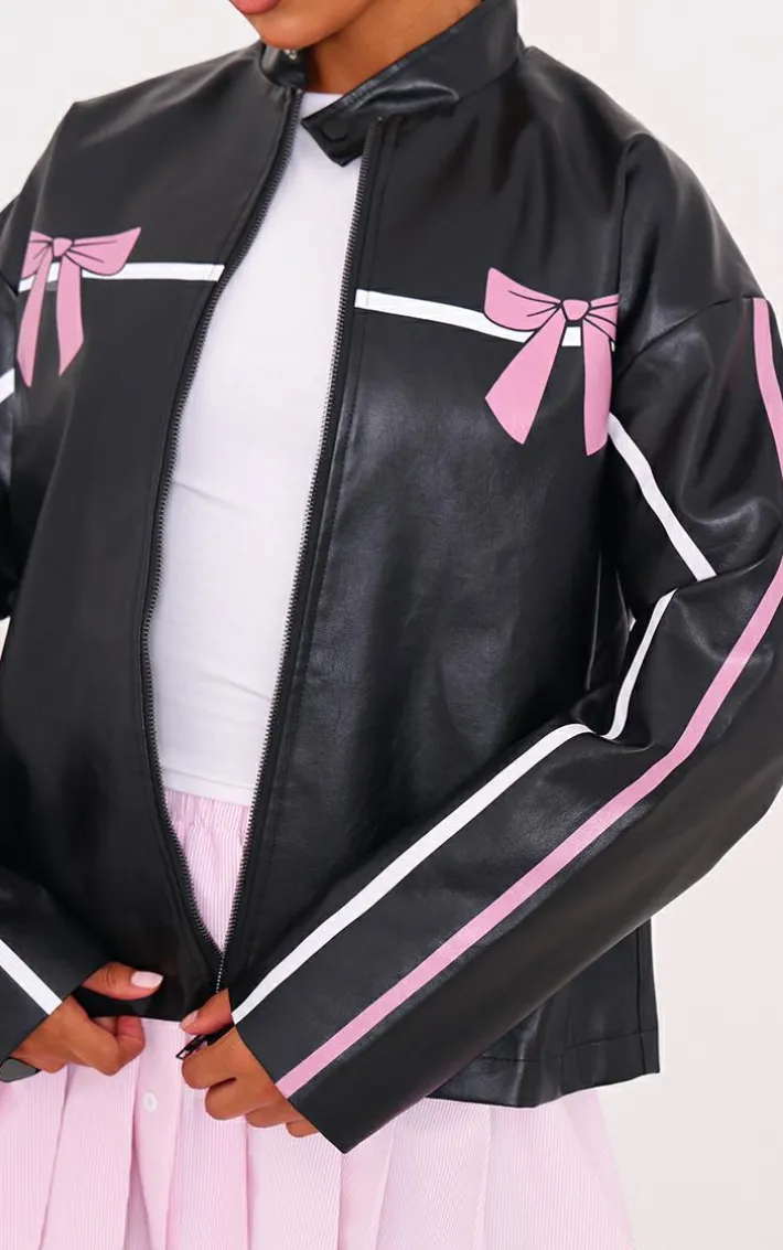 Earn all the styling points with this black faux leather bow print detail jacket. Brought to you in a black faux leather material with a bow print design that will have you setting major trends wherever you step foot. Team this unreal jacket with a white tee, a mini skirt and some knee high chunky boots for a fool proof finish like no other.