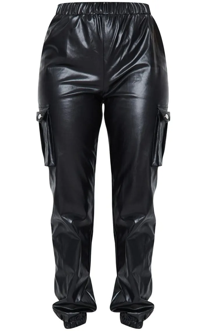 Amp up your weekend wardrobe with these bottoms. Featuring a black faux leather fabric with cargo pockets, complete the look with a crop top, blazer, strappy heels and a mini bag for a stylish combo.