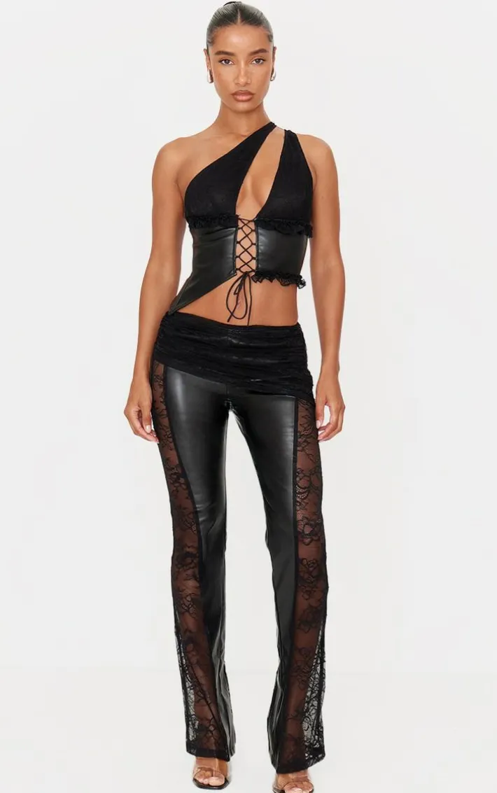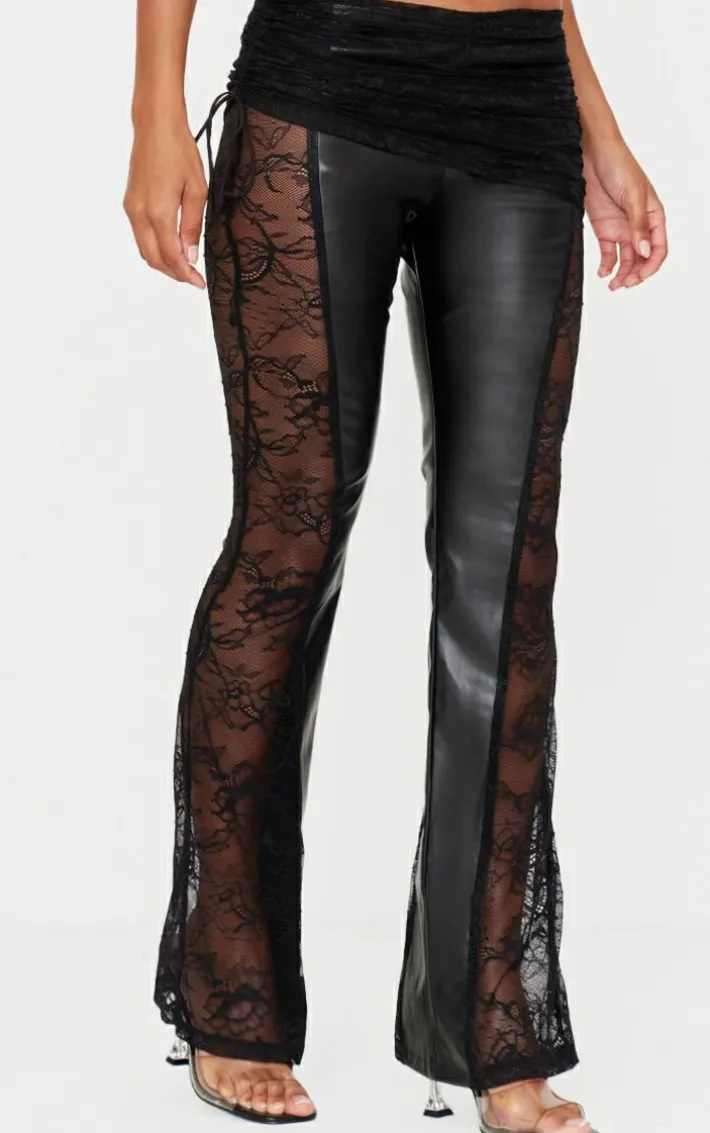 Turn your weekend look up a notch with these black faux leather lace ruched waist flared pants. Brought to you in a versatile black hue, with a luxe faux leather material, lace detailing and ruched waist design, what more could you ask for? Style with the matching top and a pair of heels for a chic finish we’re loving.