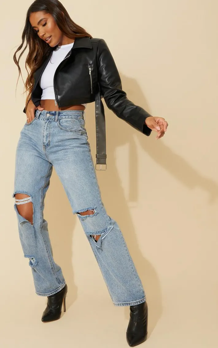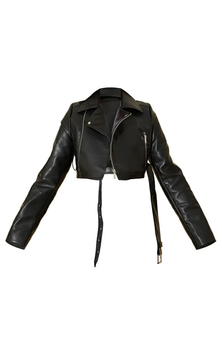 Give your outfit of the day an edge with this biker jacket. Featuring a black faux leather material with a super cropped design. Style this with light wash jeans, a cropped tee and boots for a chilled day vibe.