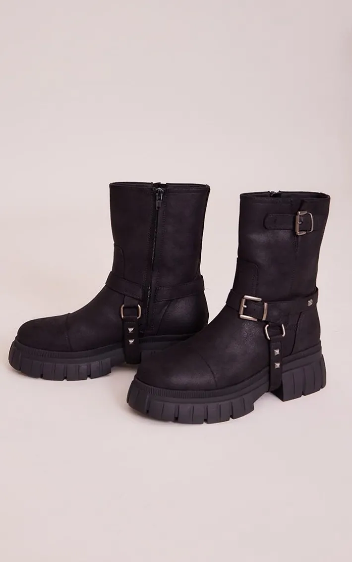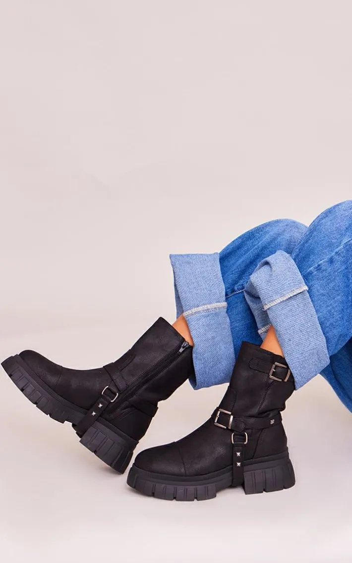 A pair of black boots is an essential in every shoe-drobe and we can’t get enough of these black faux suede round toe buckle detail chunky platform ankle boots. These ankle boots are brought to you in a black faux suede material with a round toe, buckle detail and a chunky platform, what’s not to love? Style these with your outfit of the day for a chic finish.