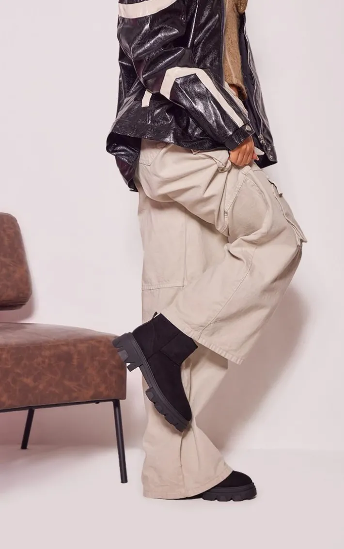 These black faux suede round toe chunky sole ankle boots are sure to be a staple in your new season wardrobe. Brought to you in a black hue faux suede material with a borg lined design for those extra cosy feels and a chunky sole, what more could you want? These low ankle boots are perfect for styling seamlessly with your outfit of the day for the perfect finishing touch to any look.