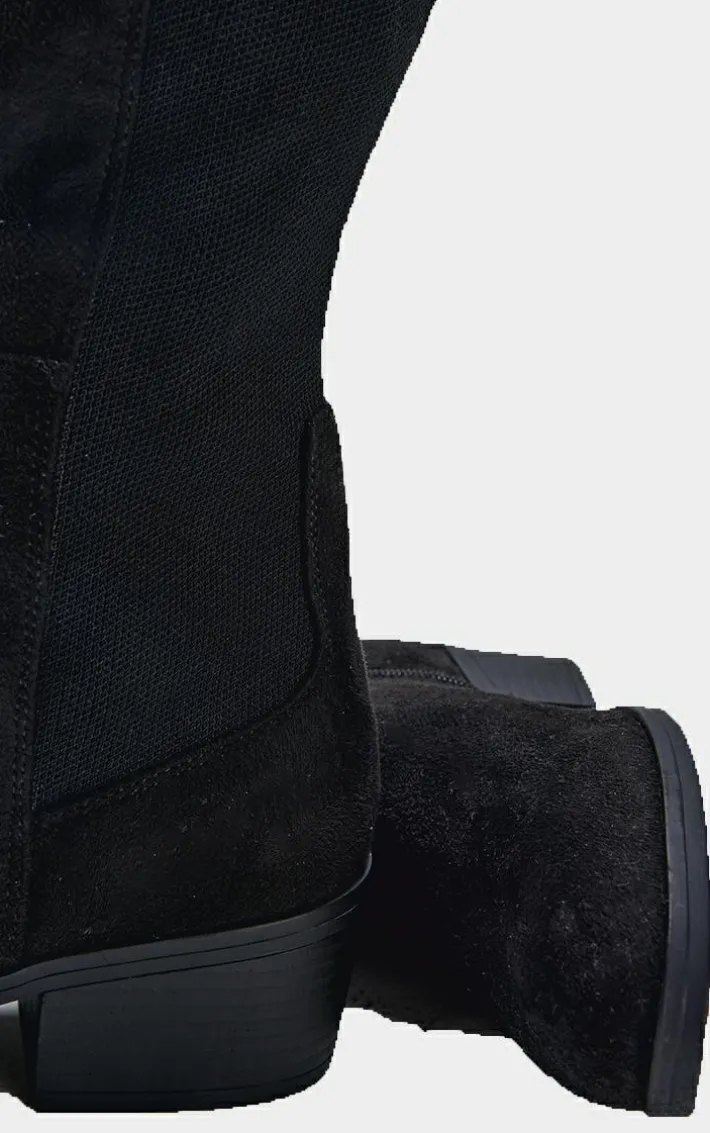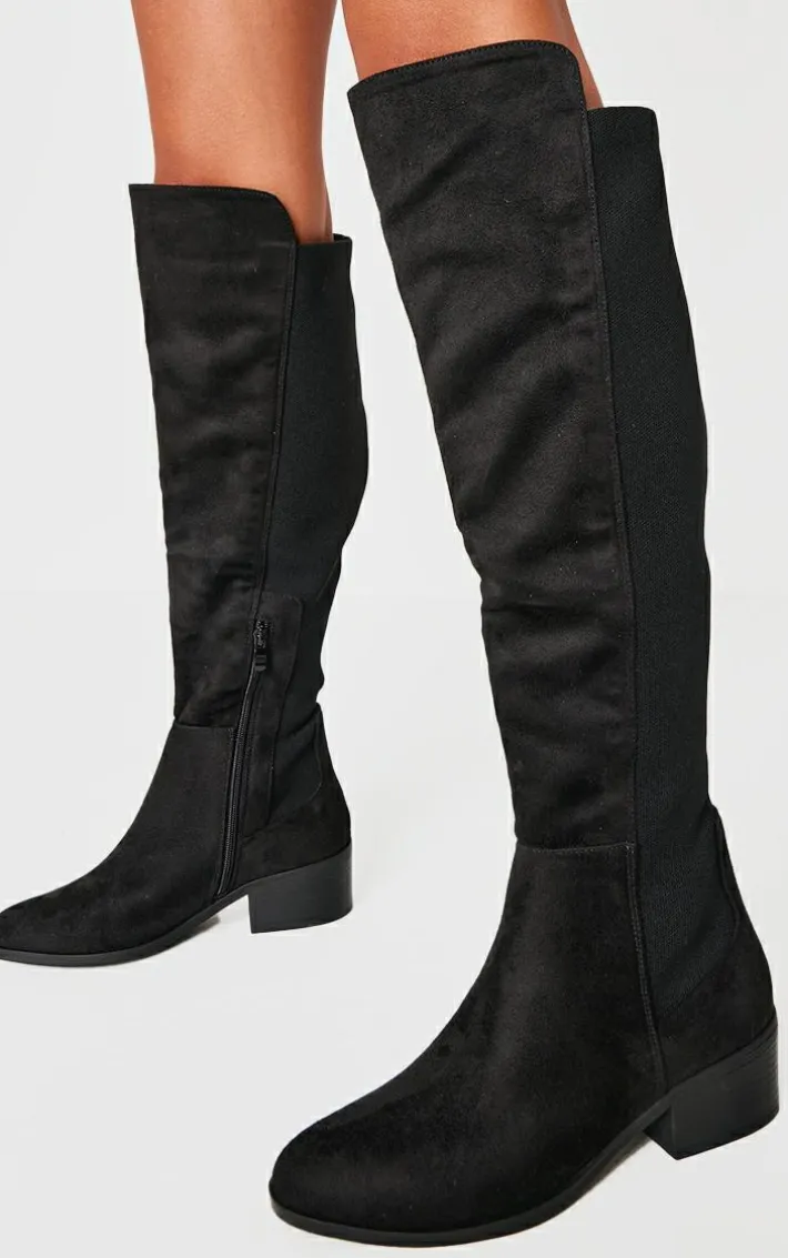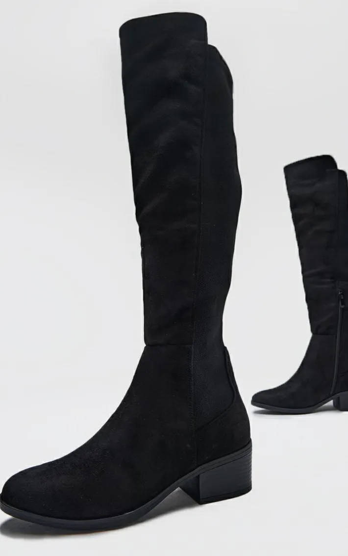 Make new season styling look effortless with these black faux suede wide fit round toe block heel knee high boots. Made from a black faux suede material with a wide fit, a round toe design and a knee high style, we are obsessed. Just add these black boots to your outfit of the day to elevate the look.