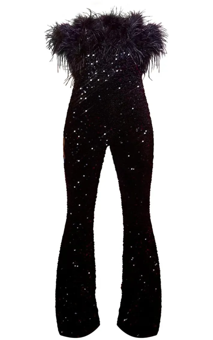 Go glam or go home this weekend with this unreal jumpsuit. Featuring a black sequin material with a feather trim detailing, a bardot design and a figure-worshipping fit, we are in love. Wear with high heels, accessories and a mini bag to complete your style.
