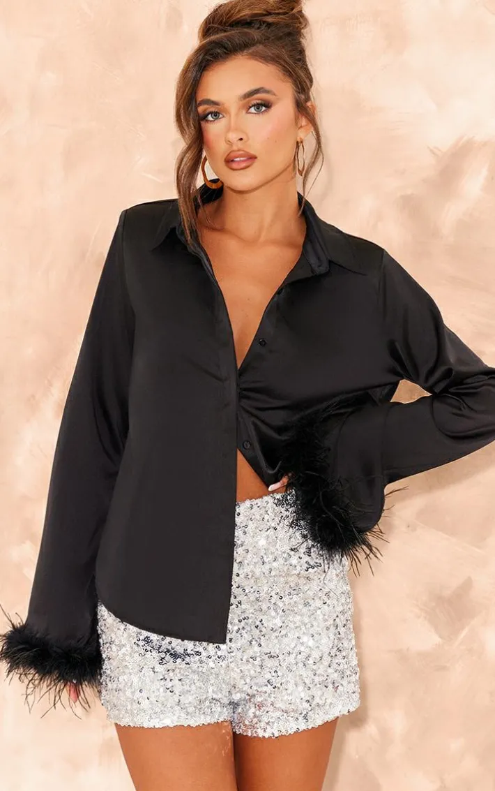 Stand out from the crowd with this shirt. Featuring a black premium material with feather trim detailing, we’re obsessed. Pair this with matching shorts and heels for a look that will have the spotlight on you.
