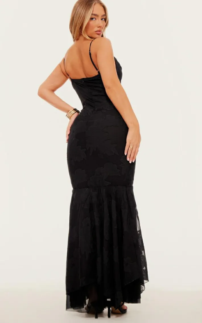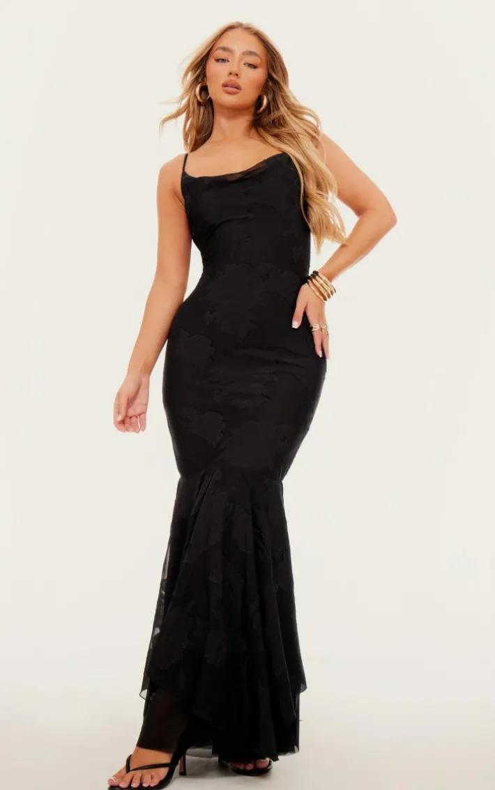 When the weekend calls so does this black floral devore cowl neck frill hem maxi dress. Brought to you in a black floral devore material with a cowl neck design and frill hem detail, this maxi dress is at the top of our wish list. Style with your fave heels and gold accessories for a statement finish we can’t stop looking at.