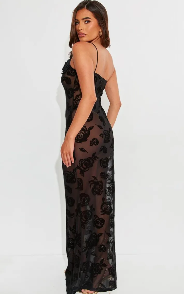 Steal all the stares with this black floral mesh one shoulder maxi dress. Brought to you in a black floral mesh material with a one shoulder design, this maxi dress is calling your name. Style with gold heels and your fave gold hoops for a look that won’t miss this season. It’s a yes from us.