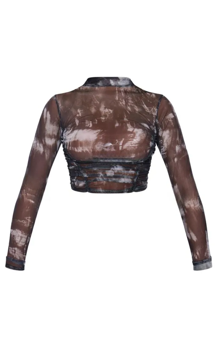 When the weekend calls so does this black floral mesh ruched side crop top. Made from a black floral mesh material with ruched side detail and long sleeves, how could you not be in love? Super flattering and here to add a touch of glam to your outfit of the day, this crop top ticks all the boxes. Team with faux leather pants, clear heels and silver accessories for a seriously luxe finish that won’t go unnoticed.