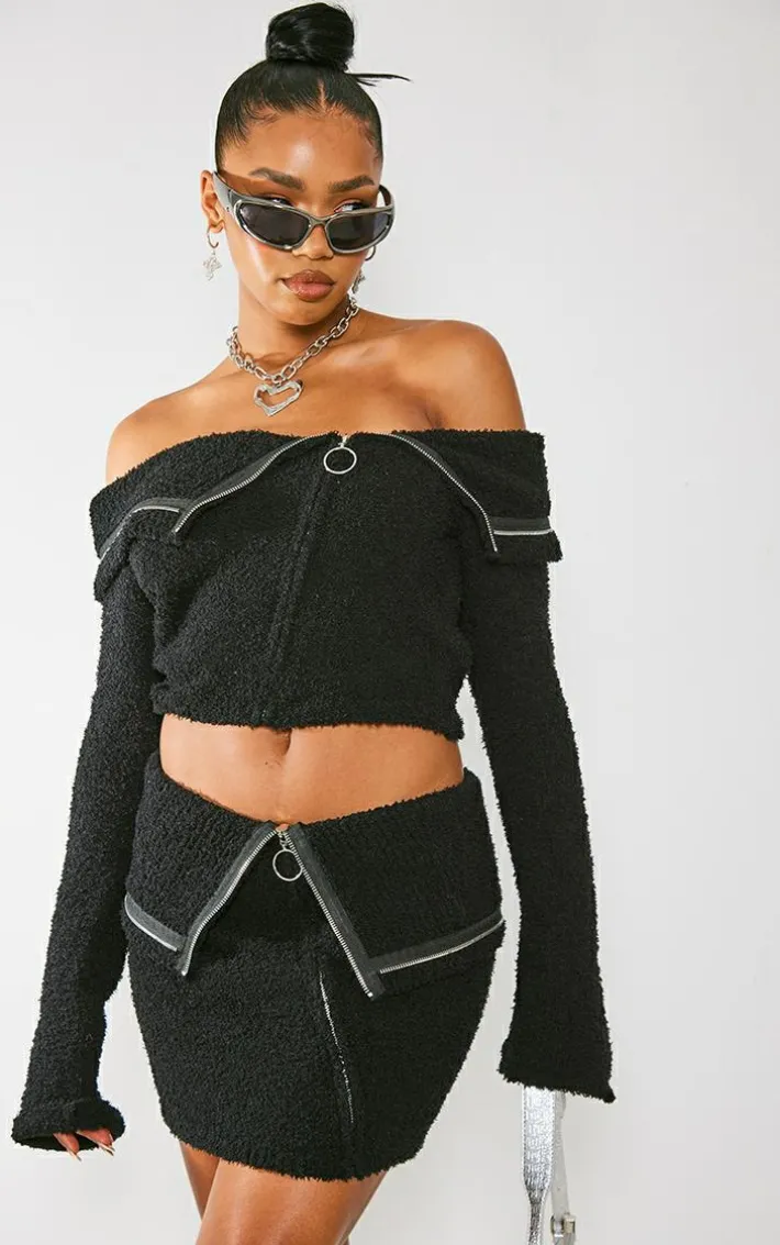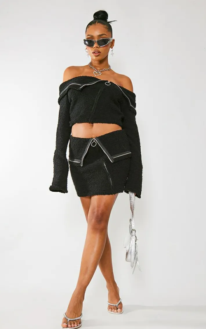 Take your weekend wardrobe to the next level with this black fluffy knit fold-over zipped mini skirt. Brought to you in a black fluffy knit material with a fold-over detail and zip fastening, how could you say no? Whether you’re meeting upor got a date night in the diary, this mini skirt is sure to gain all the compliments. Team with the matching top, metallic heels and a shoulder bag for a combo we’re crushing on.
