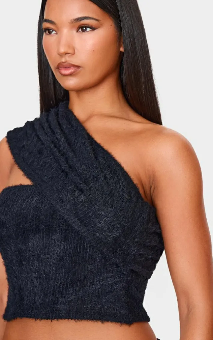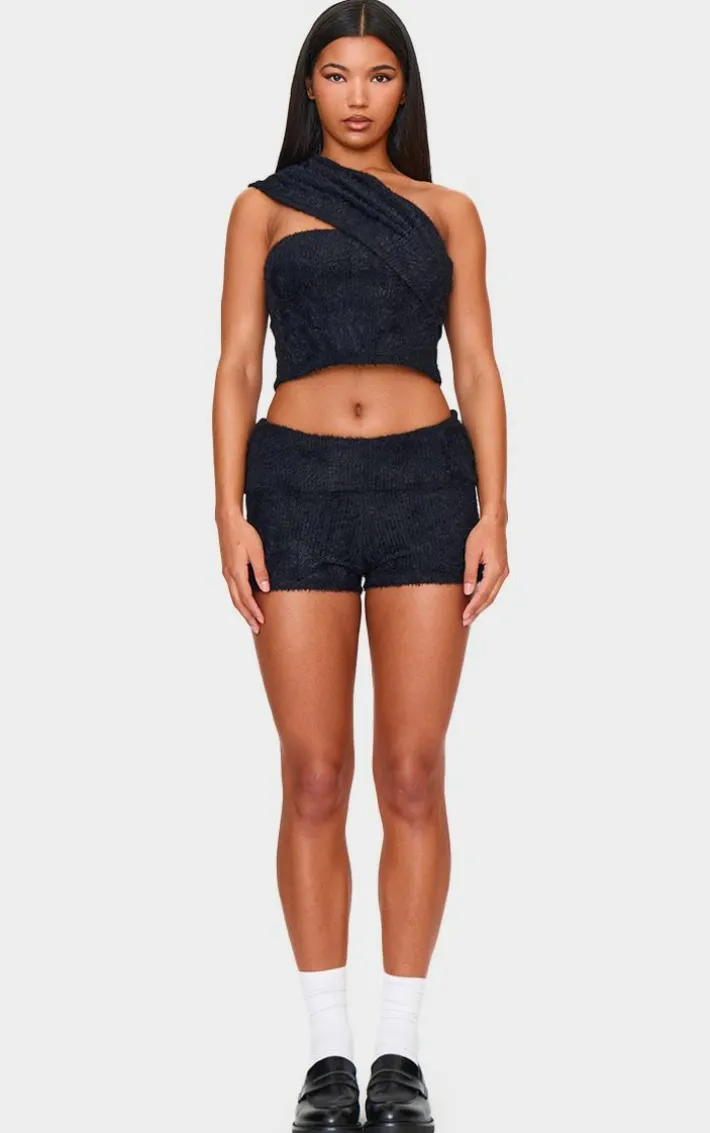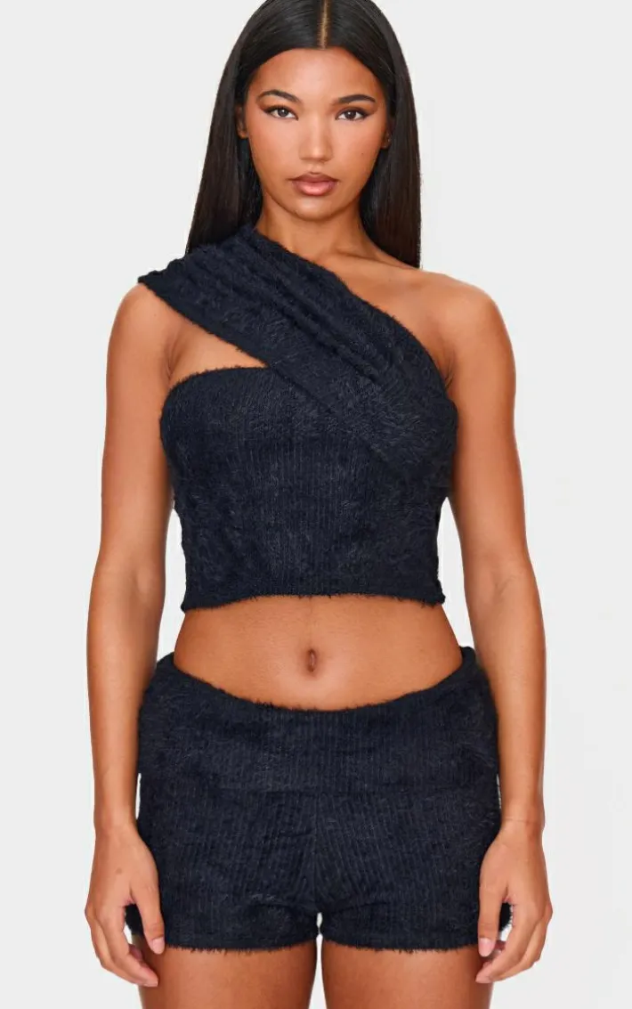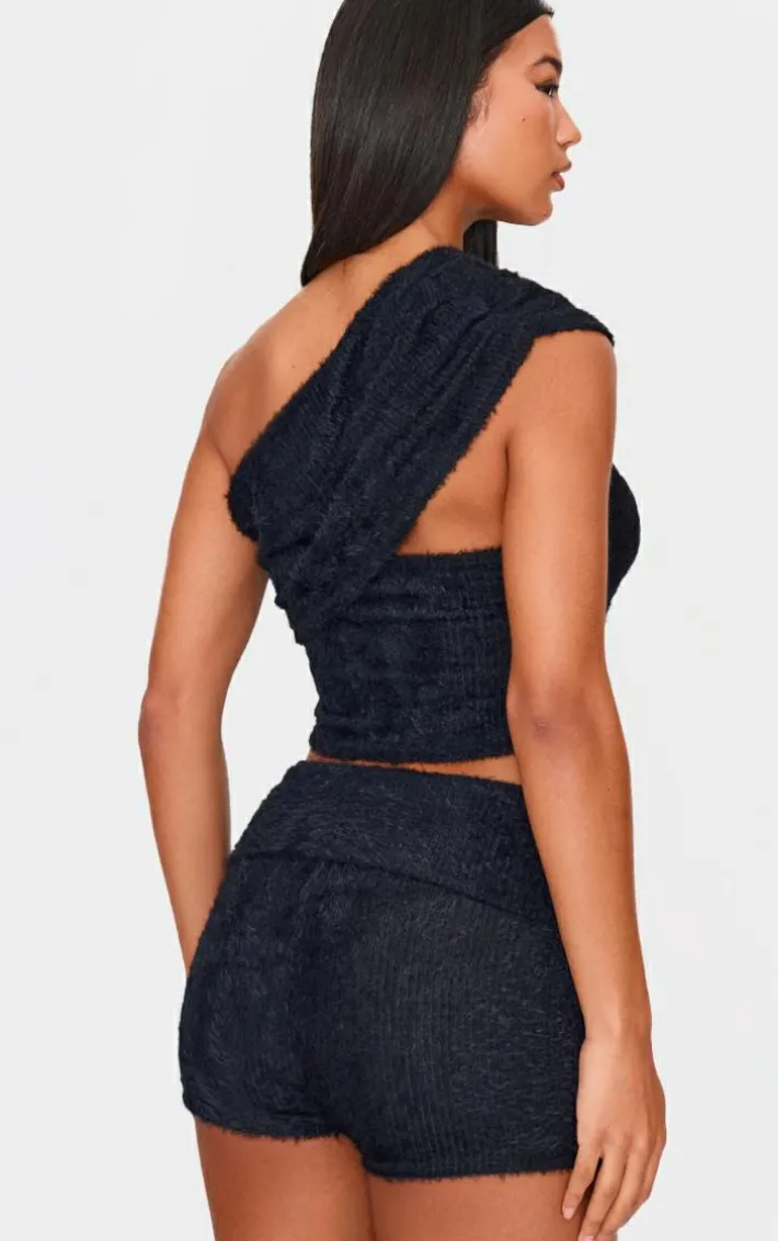 This black fluffy textured one shoulder top is a must have for all of those important occasions you have pencilled into your diary. Brought to you in a black fluffy textured material, with a one shoulder design, you won’t blend in with this top. Simply style with the matching hot pants and your fave accessories to steal all the stares whenever you enter the room.