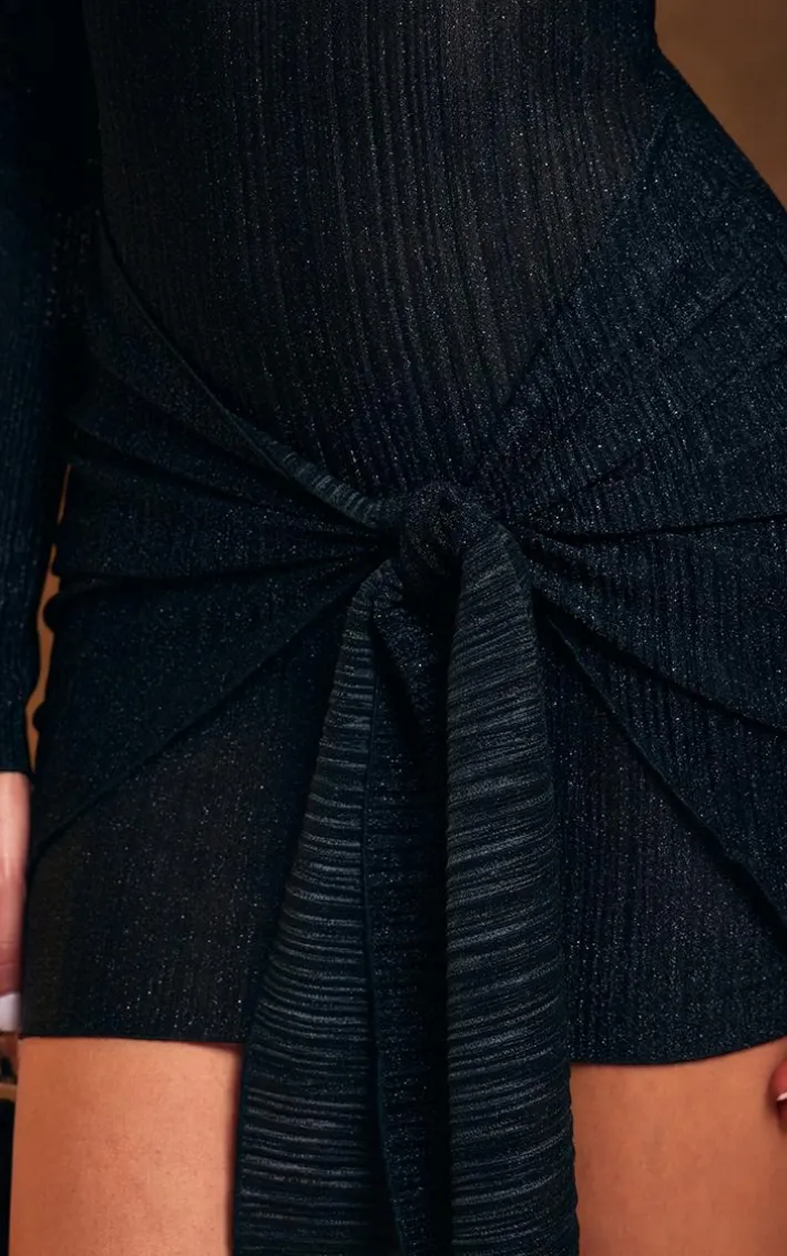 Enter party season in style with this black glitter plisse high neck long sleeve knit bodycon dress. Brought to you in a black hue plisse material with a knot design, long sleeves and a bodycon fit, how can you not fall in love? It’s glitter detailing will have you looking all kinds of glam and with a chic high neckline, you really can’t go wrong. Just add heels and statement accessories and get ready to have all eyes on you.