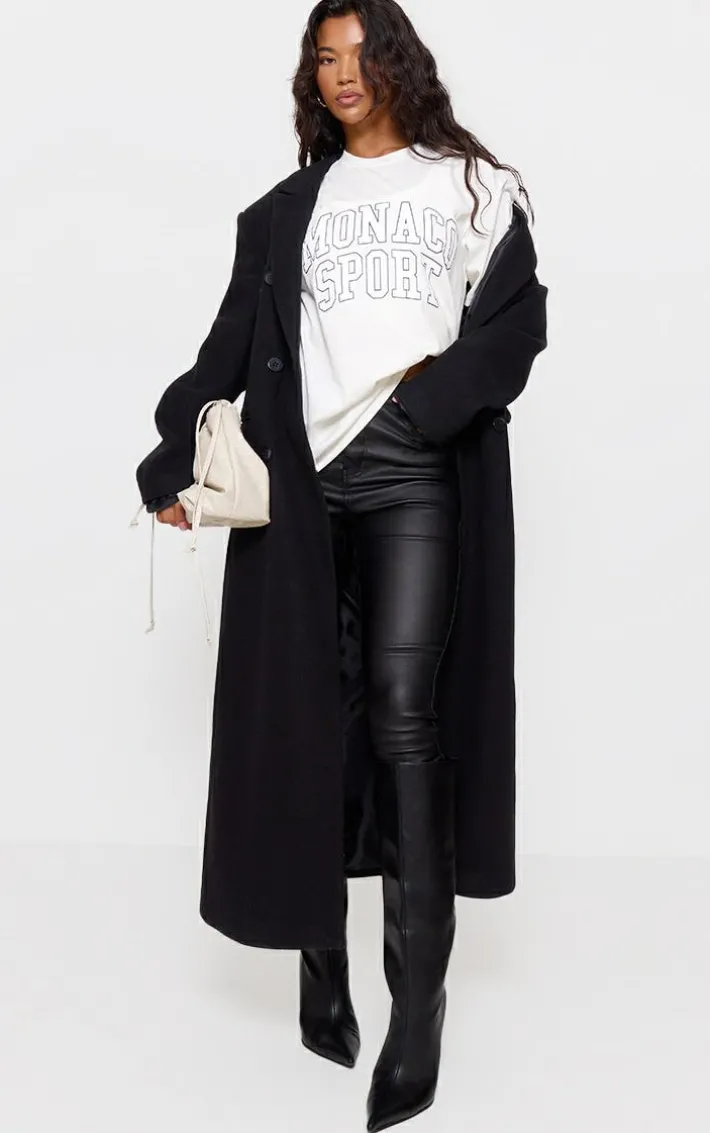 These jeans are sure to be essential for any. Featuring a black coated fabric with an hourglass design and a skinny fit, we love this teamed with a crop top and heels for a chic vibe.
