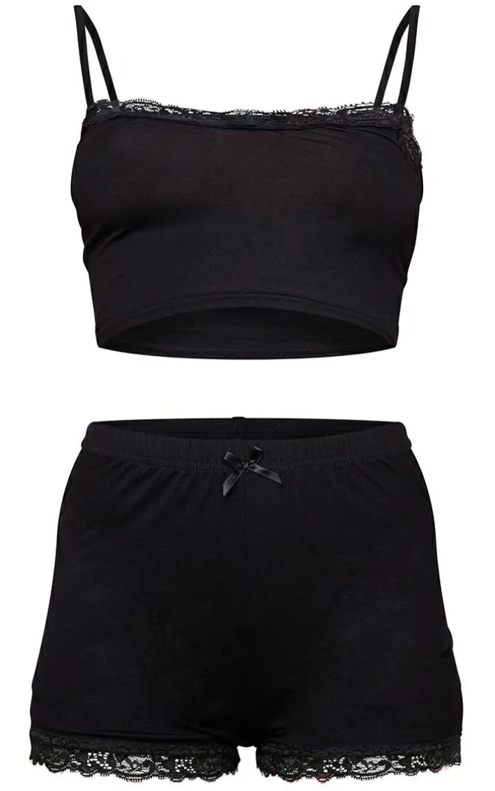 This PJ set is at the top of our new season wishlist doll. Featuring a strappy top with matching shorts, both in a black jersey material with a lace trim, it’s a must-have. Finish with a cosy gown and fluffy slippers for the ultimate night in combo.