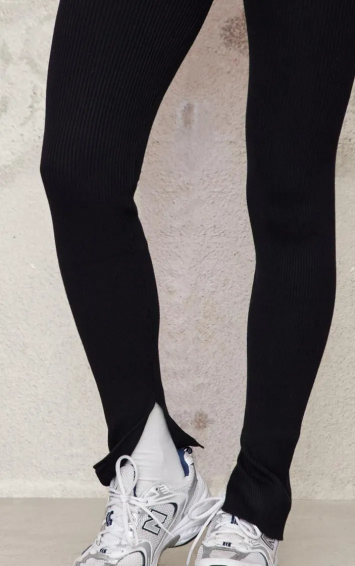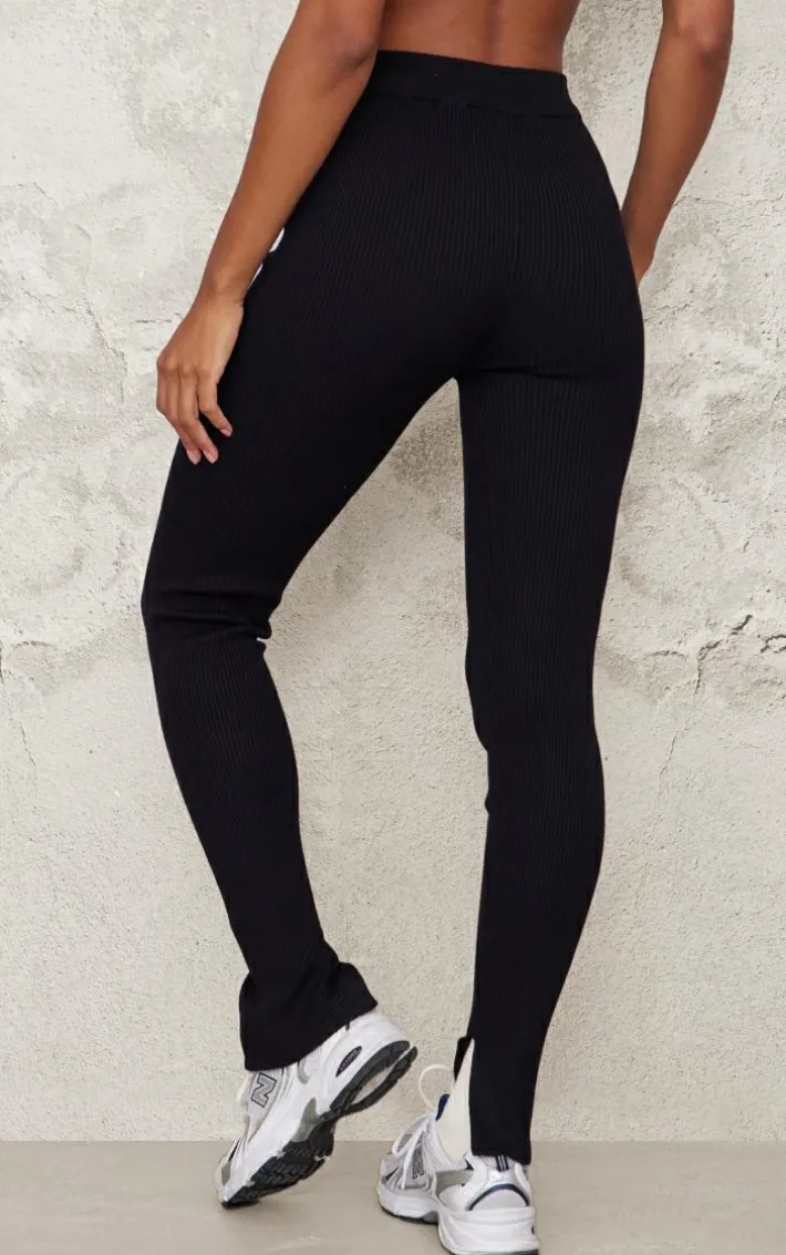 Keep your look simple but chic with these leggings. Featuring a black knitted ribbed material with a high waisted fit and a split hem design. Just add the matching pieces, a shoulder bag and fresh kicks for the perfect everyday fit that will get you noticed.