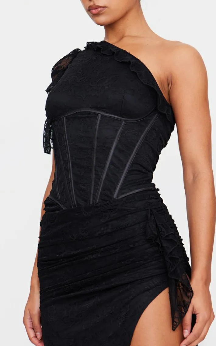 Turn heads and be center of attention with this black lace corset detail one shoulder midaxi dress. Brought to you in a black lace material with a corset detail and a one shoulder design, you are sure to feel chic in this midaxi dress. Team with a pair of heels and your fave accessories to finish off the look everyone is obsessing over.