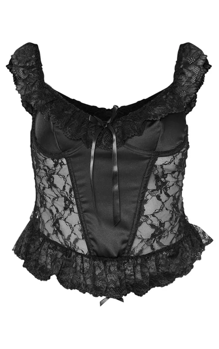 Add a touch of luxe into your new season wardrobe with this black lace satin insert bow detail corset, you won’t be able to resist. This corset is made using a black satin material with a lace insert design and bow detailing, you’re sure to be earning all the compliments. Pair with your fave bottoms, heels and statement accessories for a look everyone will be asking about.