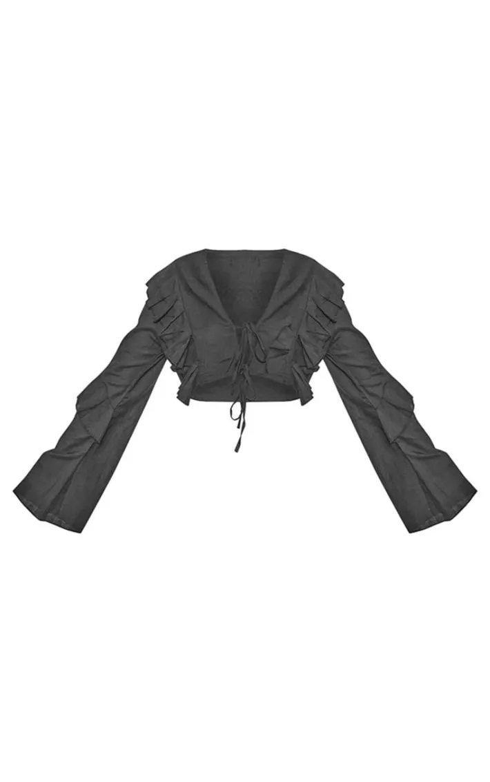 If you’re looking for a fiercely feminine shirt, this black linen ruffle front tie cropped shirt is the answer to your what to wear dilemmas. Brought to you in a chic black linen fabric with a must-have ruffled design and front tie feature, you’ll be feeling so confident in this. Pair this cropped shirt with the matching maxi skirt, flats and a statement necklace.
