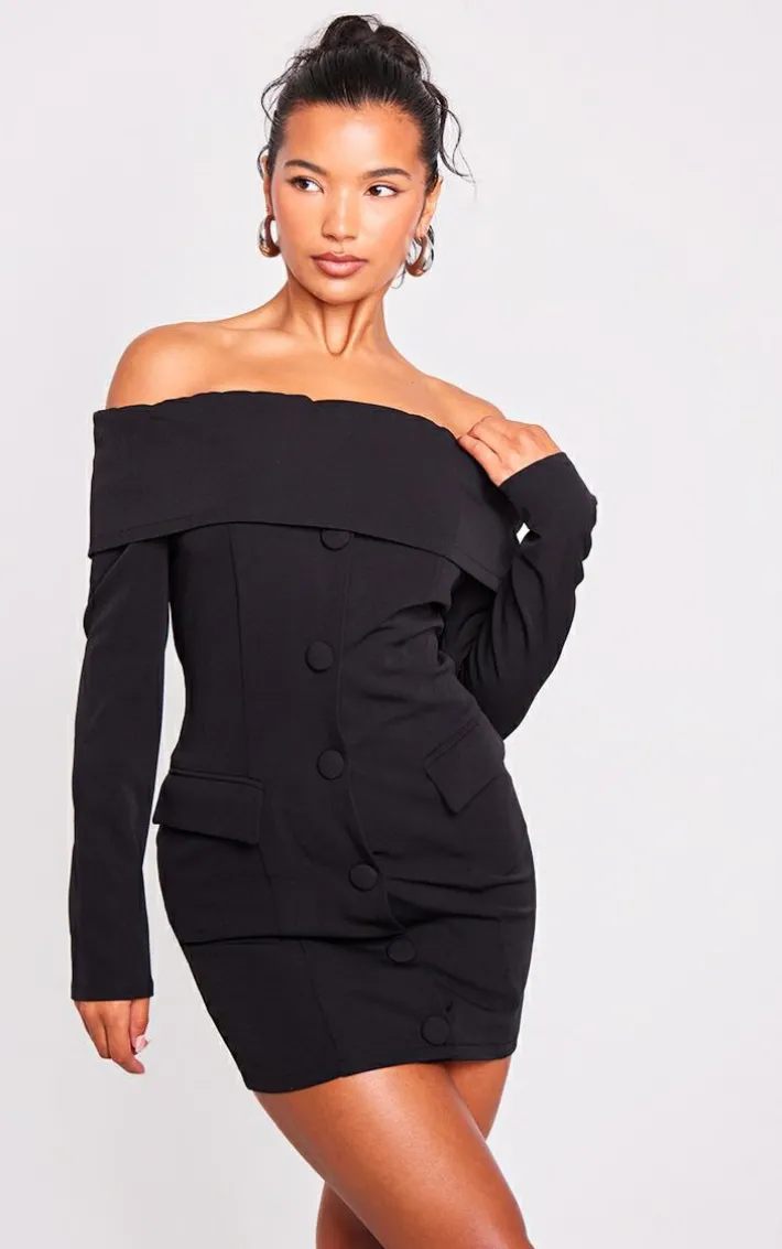 Bring all chic vibes to your weekend fit with this black off shoulder button front shift blazer dress. Made from a black hue material with button-front detailing and an off the shoulder design, how could you say no? This blazer dress is everything we’re loving and more this season and is sure to turn heads wherever you set foot. Style effortlessly with knee-high boots and silver accessories for a flawless finish.