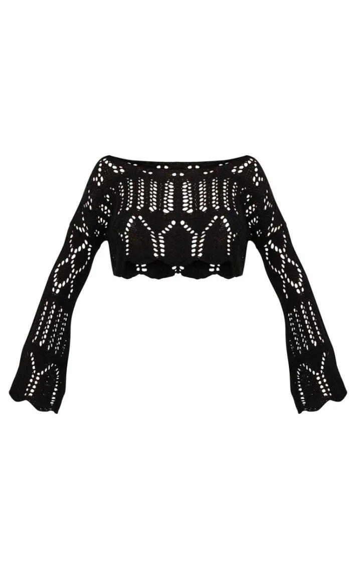 Switch up your new season style game with this black open crochet knit slouchy flared sleeve sweater, we’re in love. This sweater features a black open crochet knit material with flared sleeves and a slouchy design. Team with a maxi skirt, heels and a statement accessories for a look no one will forget.