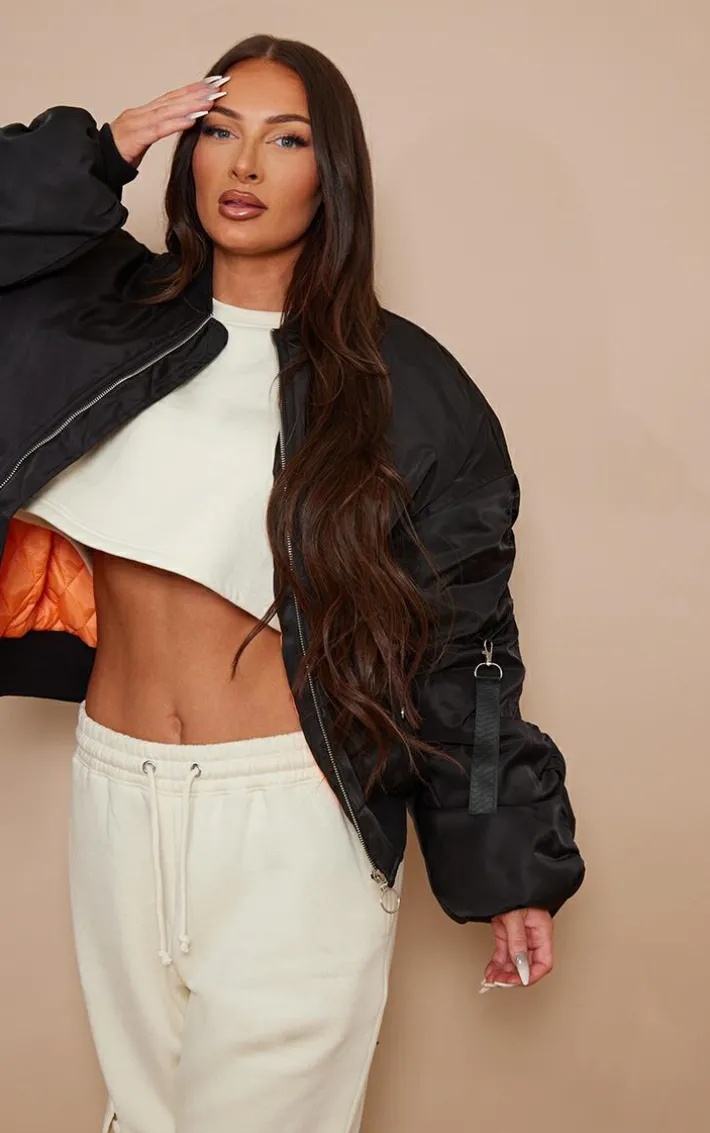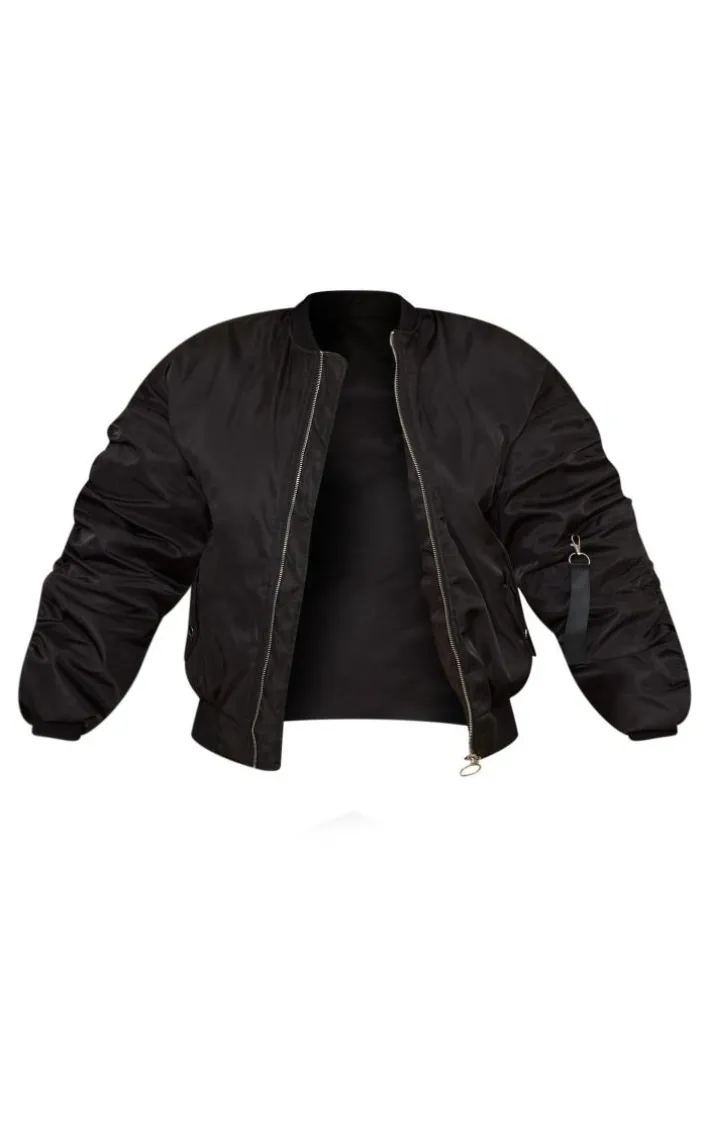 Upgrade your outerwear collection with this black oversized ruched sleeve contrast lining bomber jacket. Its black hue material gives you endless styling possibilities whilst its ruched sleeves and contrast lining adds a chic touch to your everyday vibe. This bomber jacket has an oversized fit and zip details which is seriously luxe. Work your insane styling techniques and add sweatpants, a basic tee, and box-fresh sneakers for a vibe that won’t go unnoticed.