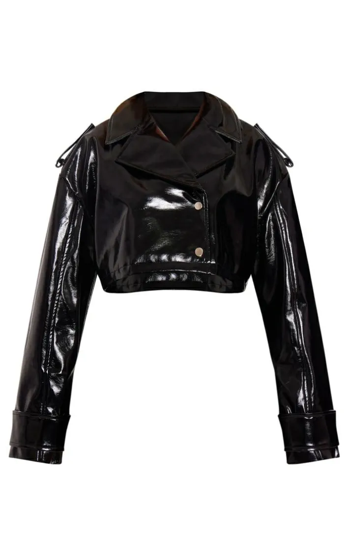 Make a statement with this black patent faux leather cropped trench. Brought to you in a black patent faux leather material, you are sure to bring all the edge to your outfit of the day. Its cropped length is the ultimate must have. Style with a mini skirt and a pair of statement knee high heeled boots to have heads turning for all the right reasons.