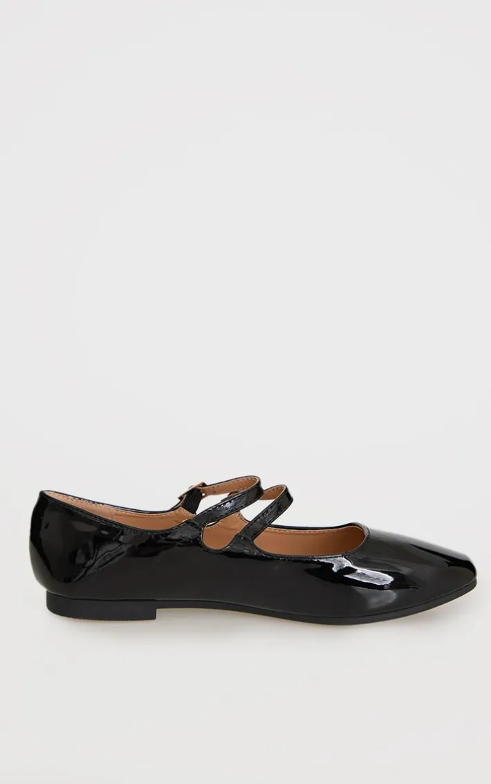 Be on trend this season with these black patent PU square toe double strap flat ballets. Brought to you in a black patent PU material with a square toe design and a double strap detailing, what more could you want? These ballet flats are all you need to step out in style. Pair with your fave outfit to turn heads this season.