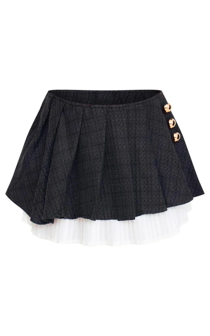 Add some luxe pieces to your wardrobe with this black pleated textured boucle mini skirt. Brought to you in a black boucle material with a pleated design and a textured detail. With its mini length, you are sure to feel confident. Pair with a crop top and your go-to heels for a finished look like no other.