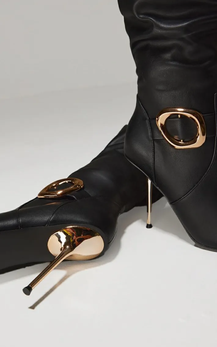 Make a statement in these black PU gold buckle point toe high stiletto over the knee boots. Brought to you in a black material with a point toe design, bold buckle detailing and an over the knee style, we are obsessed. Simply add these high stiletto boots to your weekend outfit to instantly elevate the look.
