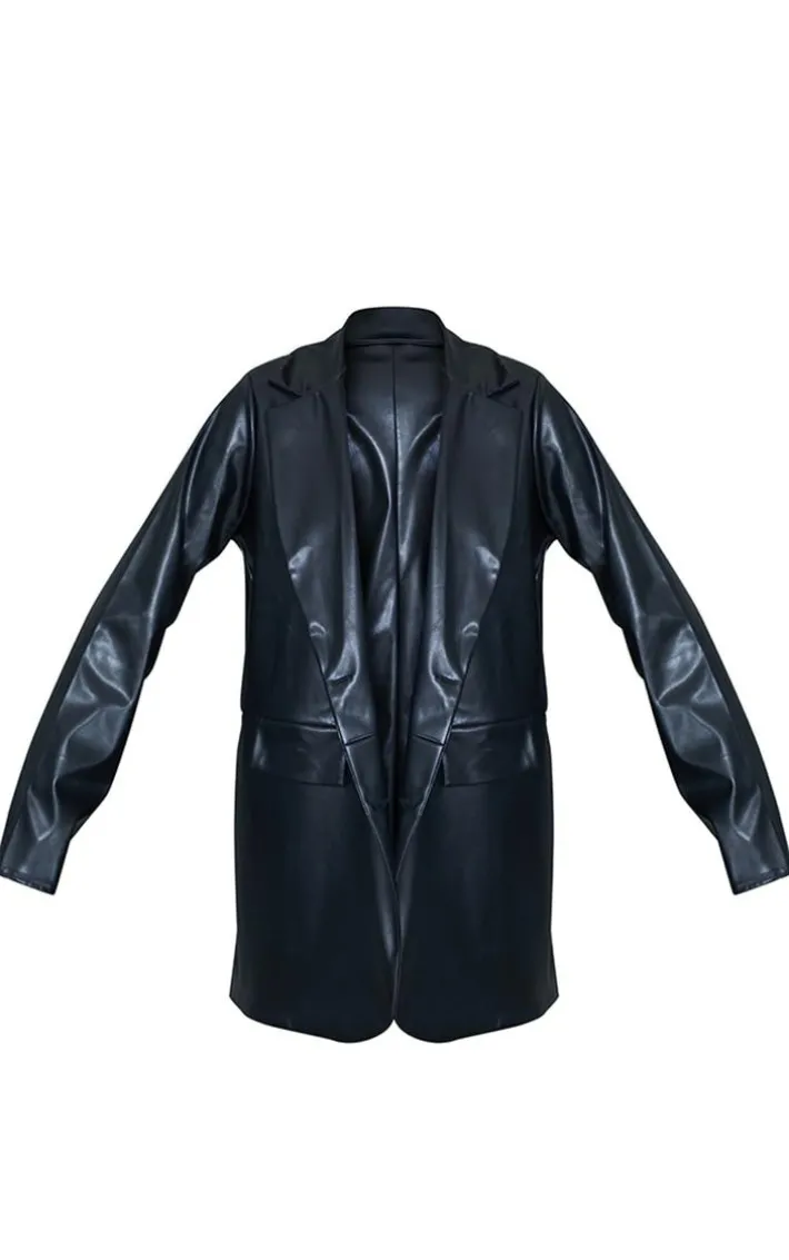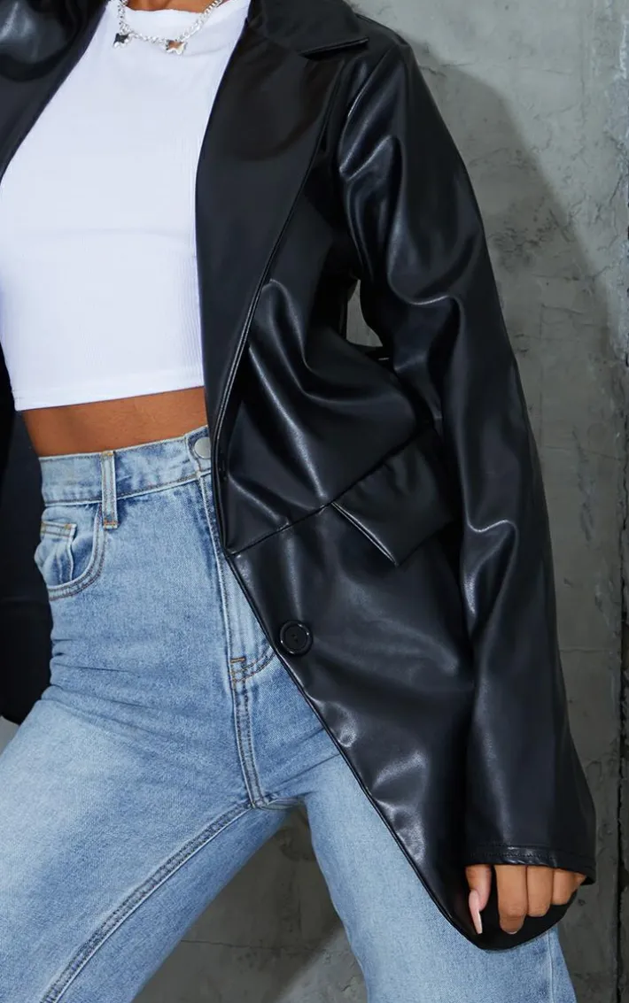 This blazer is sure to add an edge to your look. Featuring a black PU fabric with a pocket look and double button detail, team this with jeans and boots for a shopping date.
