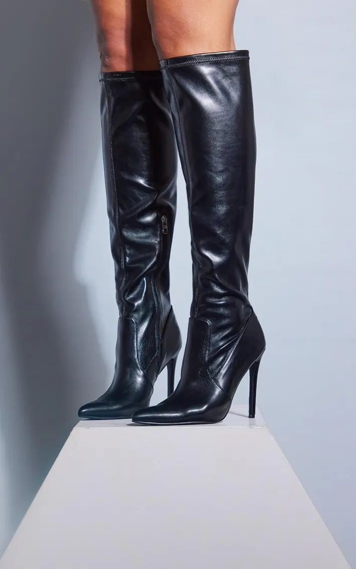 You are sure to make a statement with these heeled boots. Featuring a black PU material with a point toe, stiletto heel and over the knee length, we are beyond obsessed.