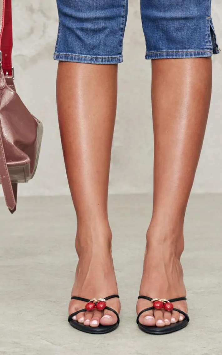 Switch up your everyday heels with these black PU round toe cherry trim heeled mules. Made with a black PU material, a round toe fit and a pop of color with their cherry trim feature, they’re a simple way to elevate your look. Style these heeled mules with your favorite denim jeans for a nostalgic finish.