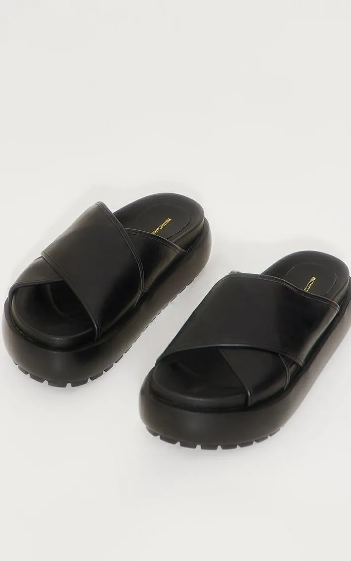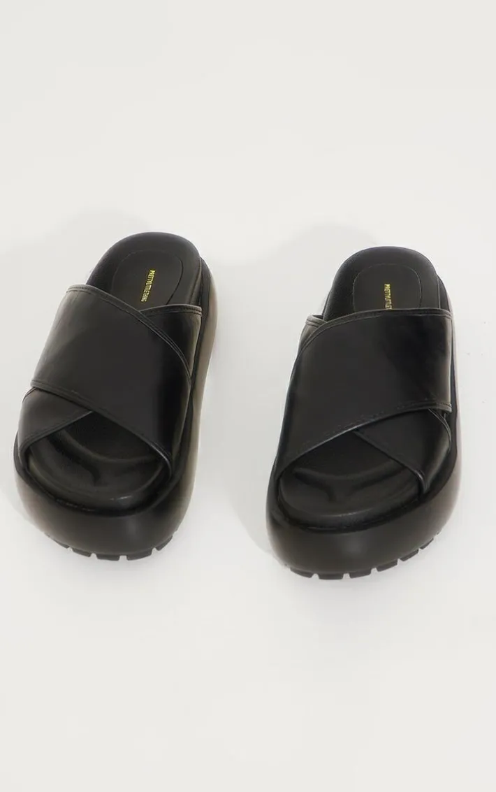 Step out in style with these black PU round toe cross strap chunky platform sandals. These sandals are brought to you in a black PU material with a round toe, a cross strap and a chunky platform, how could you turn these down? Style these with your outfit of the day for a vibe like no other.