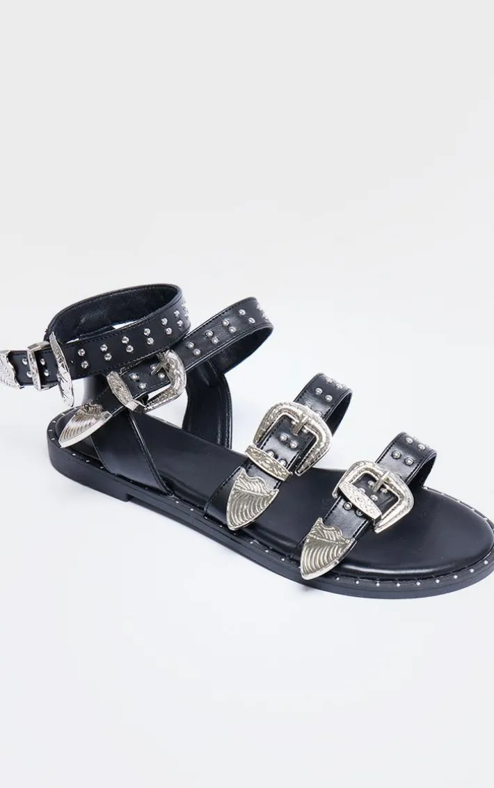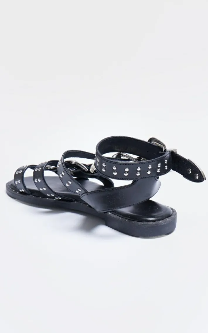 Instantly elevate your outfit of the day with these black PU round toe studded buckle detail gladiator sandals. Brought to you in a black PU material with a round toe design, buckle fastenings and stud detailing for that extra added edge, we are obsessed. Style these gladiator sandals with your fave wardrobe pieces to take your look to new heights.