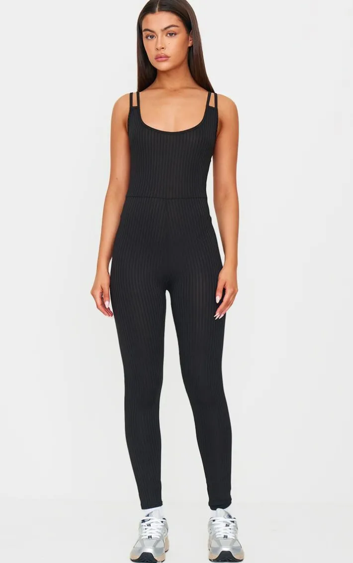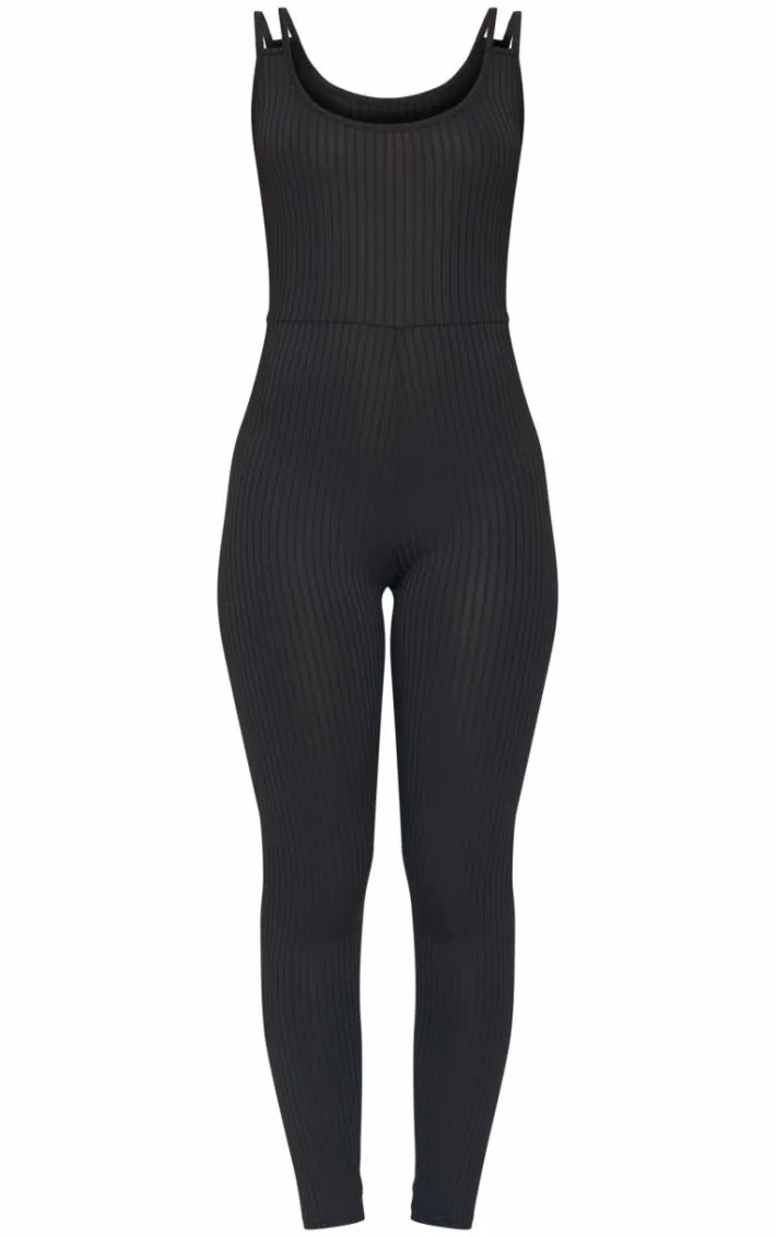 This black rib double strap jumpsuit is simple yet so essential for you. Made from a black rib material with double shoulder straps and a figure-hugging fit, what more could you want? Style this black jumpsuit with running shoes and hoop earrings for the ultimate everyday look.