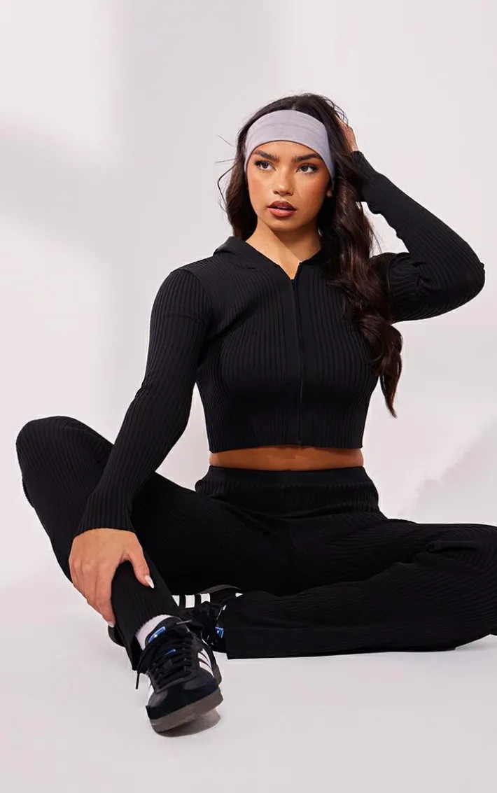 Meet your new season wardrobe essential with this black rib knit zip up long sleeve co ord, everyday styling has never been more simple. This co ord features a long sleeve zip up top and matching bottoms both in a black rib knit material, what more could you want? Team with sneakers and a headband for a fresh look that is totally on trend.