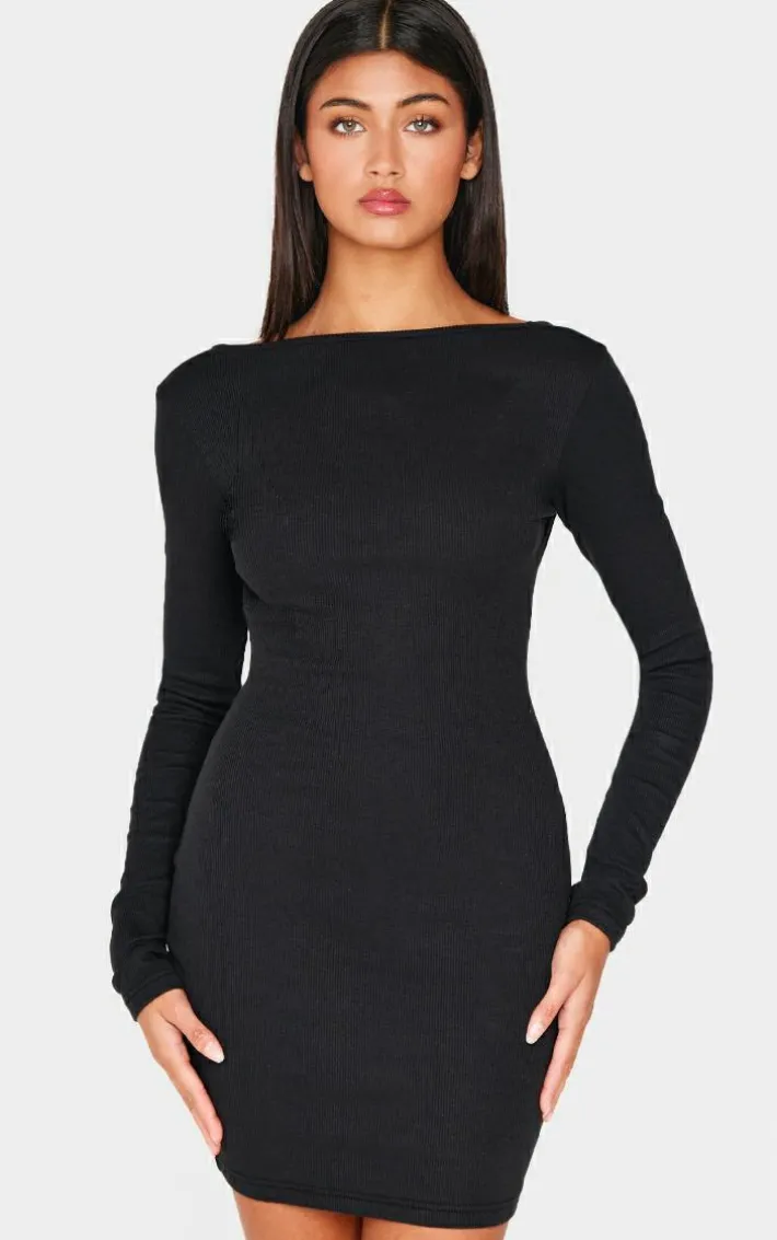 Show off your shape with this black ribbed low back long sleeve bodycon dress. Brought to you in a black ribbed material with a low back design, it’s a yes from us. This bodycon dress has a long sleeve fit that will have you feeling chic. Team with a pair of knee high heeled boots and a statement bag for a fool proof finish.