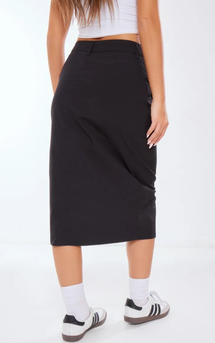 This black ripstop cargo midi skirt is sure to be a staple in your off-duty wardrobe. Brought to you in a black hue ripstop material with an on-trend cargo design and a midi length, what more could you ask for? Perfect for dressing up or down, this midi skirt will have you earning some serious style points all season long. Team with a white tee, sneakers and a faux leather jacket for a simple yet chic everyday look.