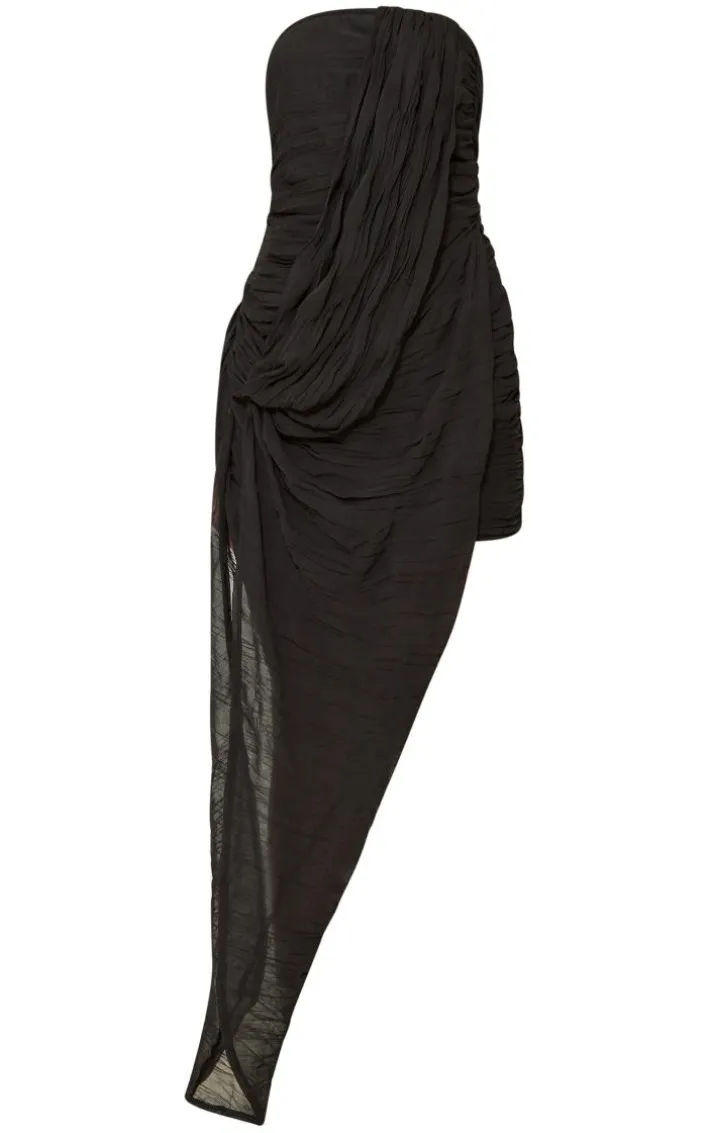 Get all dressed up this weekend with this black ruched chiffon drape bandeau midaxi dress and become the center of attention. Its black chiffon material adds an instant touch of luxe to your look and its ruched detailing gives you a super flattering fit. This midaxi dress also features a bandeau neckline and drape design which brings all the glam vibes. No matter what your plans are, team this midaxi dress with lace-up heels and a mini bag for an insta-worthy finish.