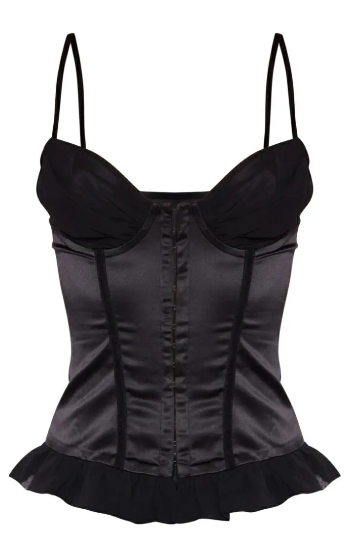 Your wardrobe is calling out for this black satin chiffon bust insert hook and eye frill hem corset. Brought to you in a black satin material for a touch of luxe, while its chiffon bust insert will give you a flattering fit like no other. When the weekend calls, so does this unreal corset, so what are you waiting for ? Shop the look by pairing with a mini skirt and some knee high boots, you won’t blend on.