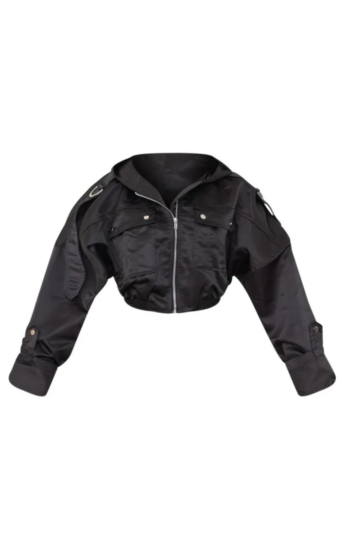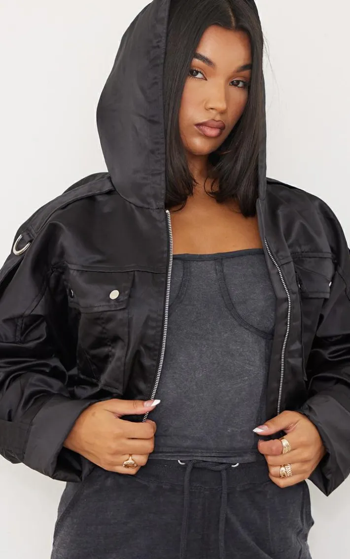 This satin bomber jacket is perfect for adding to any outfit of the day to take your look to new heights. Featuring a black satin material with a hooded design and pocket detailing, we are obsessed. This oversized bomber jacket is everything we are loving to give your new season look a chic finish, it is sure to be a staple piece in your wardrobe. Team this black bomber jacket with a simple bodysuit, light wash jeans and knee-high boots to finish the look.