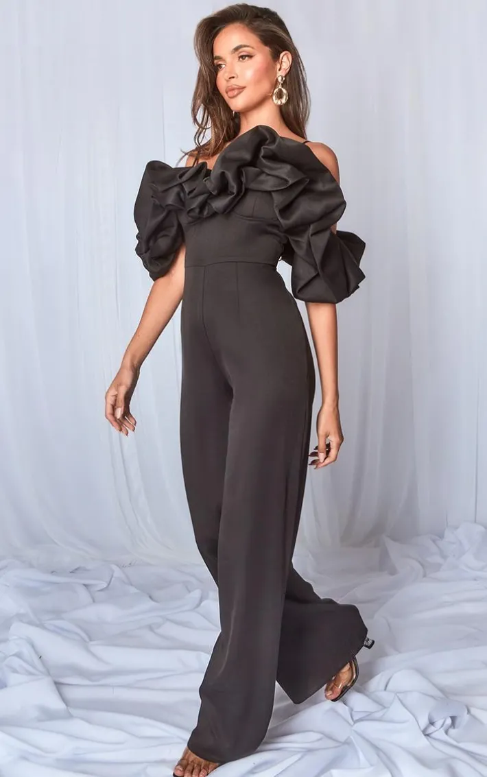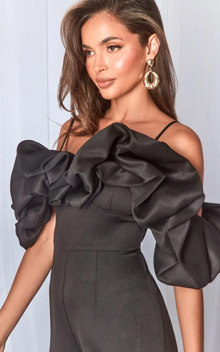 Say hello to your new season staple with this black satin puffball bardot strappy jumpsuit. This jumpsuit is brought to you in a black satin material with a puffball design, bardot style and a figure-hugging fit, what’s not to love? This jumpsuit is calling your name. Just add high heels and your statement accessories for a look like no other.