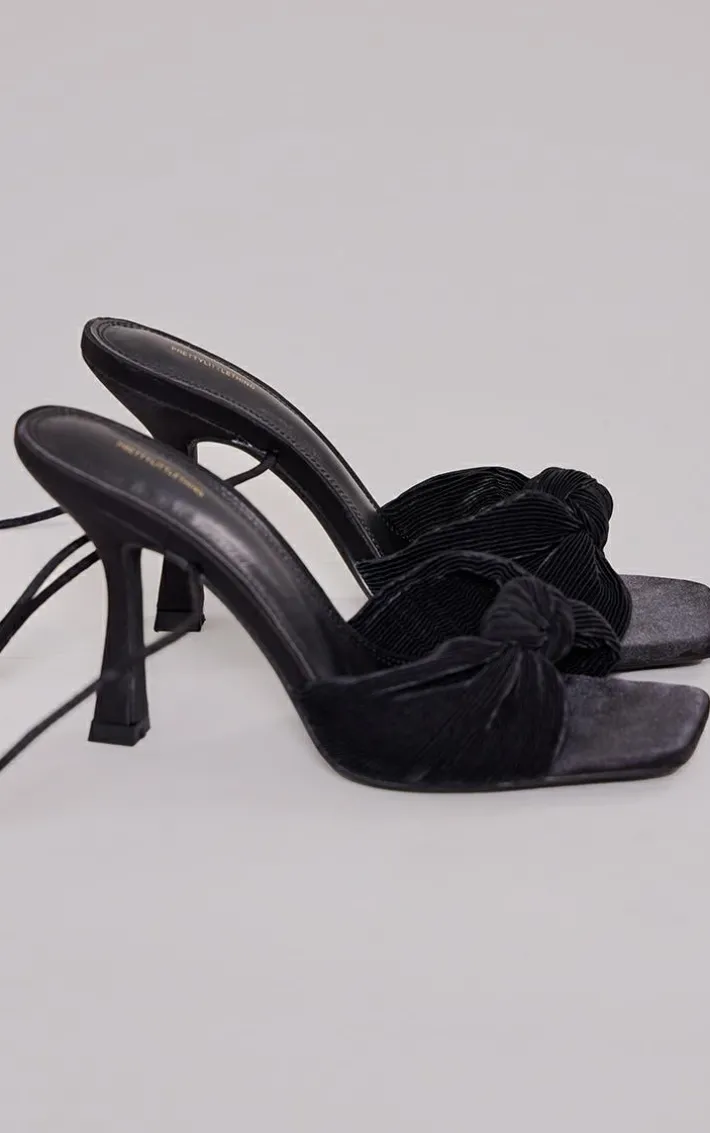 Inject a touch of glam to your weekend ‘fit with these black satin pleated square toe knotted strappy high-heeled sandals. Made from a black satin material with a pleated design and a knotted detail, what more could you ask for? These high-heeled sandals are the ultimate addition to your collection and are sure to earn all the style points.
