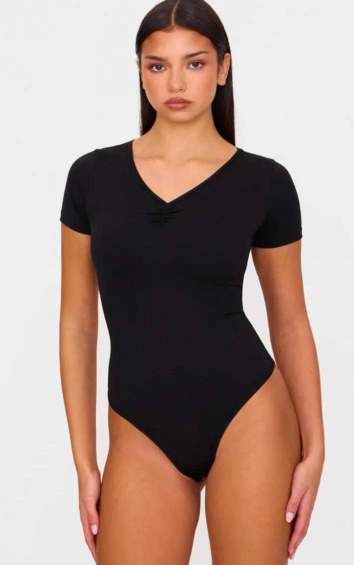 Switch up your off-duty style game with this black sculpt gathered short sleeve bodysuit. Brought to you in a black hue sculpt material with short sleeves and gathered detailing, what’s not to love? Team this black bodysuit with ballet flats and your go-to accessories for a look you will be reaching for again and again.