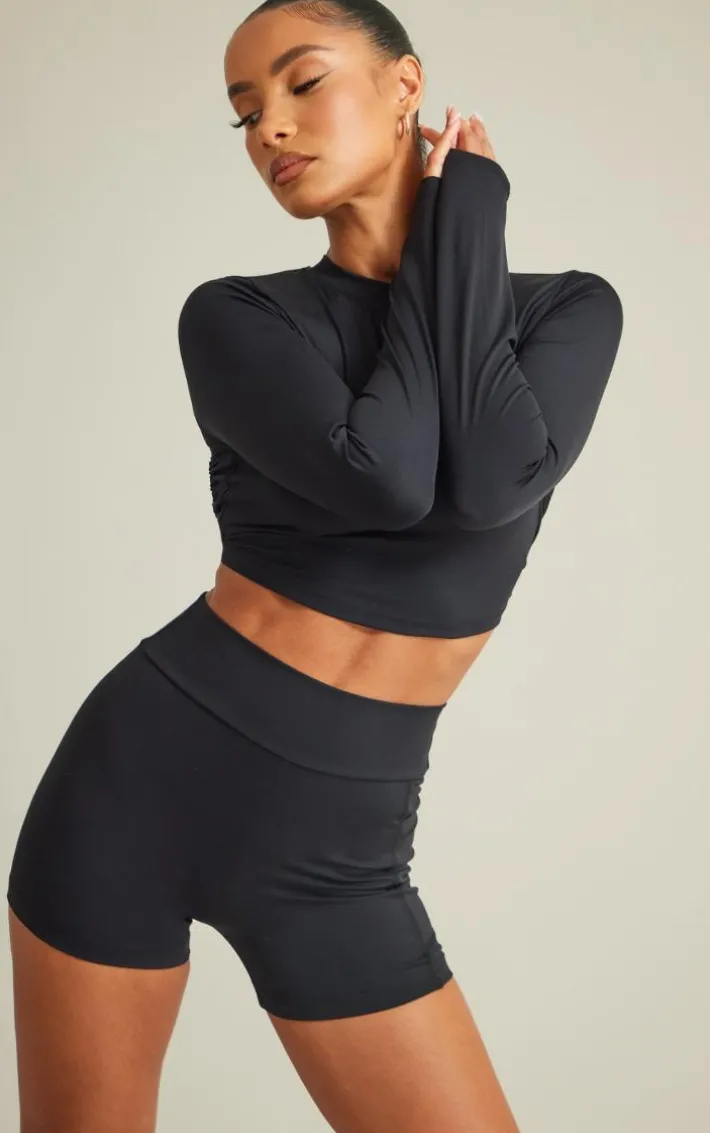 Give your workout wardrobe a serious update with this black sculpt ruched cut out tie back long sleeve top. Made from a black hue material with a cur out design, tie back detailing, long sleeves and a cropped fit, what more could you want? Team this top with the matching shorts, fresh kicks and your go-to accessories for a gym-ready ‘fit that is sure to become a fave for your workouts.