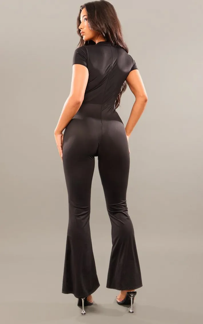 Make weekend styling look effortlessly chic in this black sculpt short sleeve jumpsuit. Brought to you in a black hue sculpt material with short sleeves andfigure-hugging fit, how can you go wrong? Perfect for dressing up or down, this black jumpsuit is sure to be a staple in your new season wardrobe. Simply add heels and some glam accessories for a look worthy of your weekend plans.