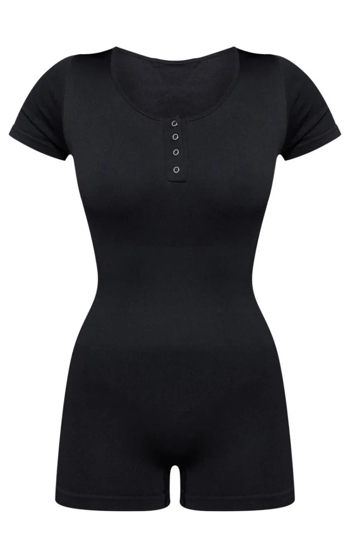 Take the stress out of weekend styling with this unreal black seamless button detail short sleeve unitard. Brought to you in a black seamless material with a button detail, you really can’t go wrong with this unitard. Style with a pair of comfy sneakers and gold accessories for a look that will have eyes on you for all the right reasons.