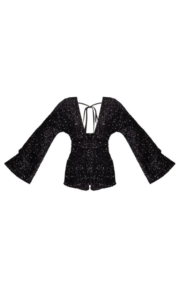 Stand out in any room with this black sequin plunge tie flared sleeve romper. Brought to you in a black sequin material with a plunge design and a tie detailing, what’s not to love? This flared sleeve romper pairs perfectly with your go-to heels and some of your fave accessories to finish off the look everyone is talking about.
